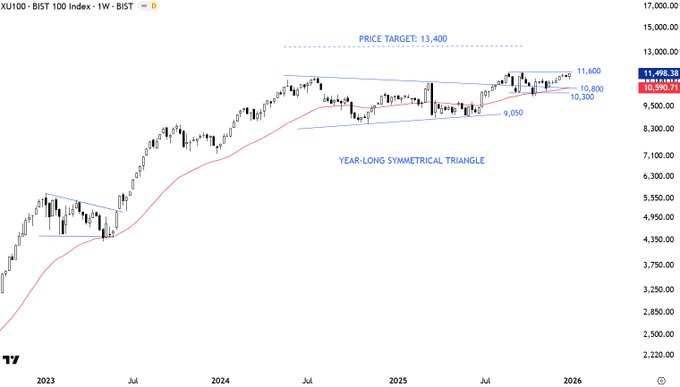 BIST 100 endeksi, haftalık grafikte oluşan simetrik üçgen formasyonu içindeki seyriyle yükseliş yönlü bir kırılma olasılığı yatırımcıların gündeminde. Mevcut teknik yapı, direnç bölgesine yakın kaldıkça 2026 başlarında güçlü bir yukarı yönlü kırılmanın artabileceği algısını güçlendiriyor.