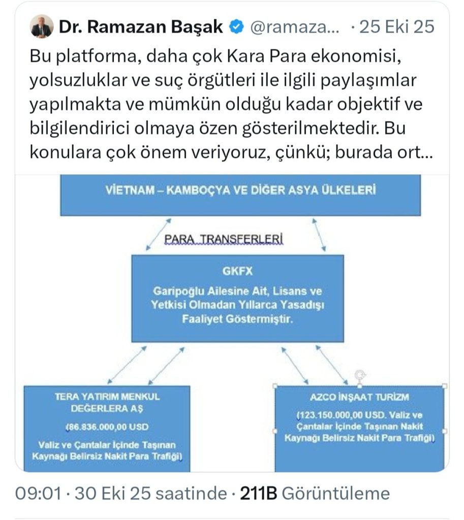 Ancak tartışma yalnızca fiyatla sınırlı değil. Eski MASAK Başkan Yardımcısı Ramazan Başak’ın kamuoyuna açık paylaşımında yer alan şema ve iddialar, konuyu doğrudan kara para, yasa dışı fon akışları ve finansal sistemin suistimali başlığına taşıyor. Paylaşımda; Asya merkezli (Vietnam–Kamboçya hattı) yasadışı faaliyetlerden elde edilen paraların, yetkisiz offshore yapılar ve paravan şirketler üzerinden Türkiye’ye aktarıldığı, bu kaynakların ise belirli aracı kurumlar ve fonlar vasıtasıyla borsaya sokulduğu iddia ediliyor.