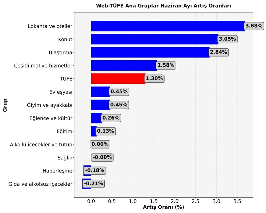 Haziran ayına ilişkin Web-TÜFE verileri, tüketici fiyatlarında ortalama %1,3’lük bir artışa işaret etti. Ancak bu artış, alt kalemlerde ciddi farklılıklar barındırıyor. En yüksek artış %3,68 ile “Lokanta ve oteller” grubunda görülürken, gıda ve iletişim harcamaları gerileme kaydetti.