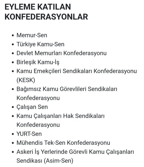 Memur-Sen, Türkiye Kamu-Sen, KESK, Birleşik Kamu-İş ve diğer konfederasyonların tamamı, 18 Ağustos’ta 1 günlük iş bırakma eylemi yapma kararı aldı. Eylem kapsamında sendikaların, üyeleriyle birlikte Hazine ve Maliye Bakanlığı’na yürüyeceği açıklandı.