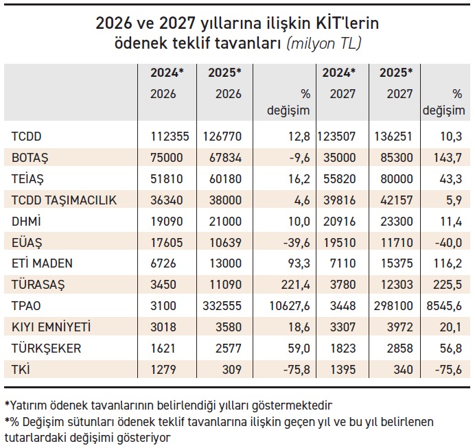 En çarpıcı artış, Türkiye Petrolleri Anonim Ortaklığı’nda (TPAO) yaşandı. Geçen yıl 2026 için yalnızca 3,1 milyar TL olarak öngörülen tavan, bu yıl 332 milyar 555 milyon TL olarak belirlendi. 2027’de de 3,4 milyar TL’den 298 milyar TL’ye çıkarıldı.