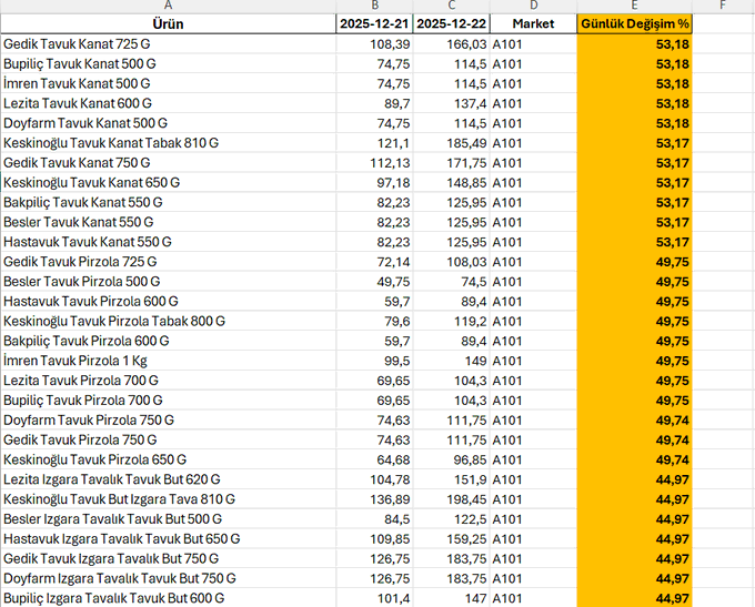 A101’de tavuk eti fiyatlarına bugün yapılan ortalama yüzde 17’lik artış, aylık enflasyon görünümü açısından kritik bir sinyal üretiyor. Bazı ürünlerde yüzde 50’yi aşan günlük fiyat ayarlamaları, gıda grubunda fiyatlama davranışlarının sertleştiğine işaret ediyor. Bu tür ani ve yaygın zamlar, TÜFE’ye kısa sürede yansıma potansiyeli taşıyor.