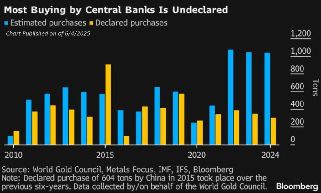 Ancak asıl çarpıcı detay, son grafikte gizli. Bloomberg’in derlediği verilere göre, 2010’dan bu yana merkez bankalarının beyan ettikleri altın alımlarıyla fiilen gerçekleştirdikleri (tahmini) altın alımları arasında ciddi bir fark bulunuyor. Özellikle Çin gibi bazı ülkelerin, resmi rakamların çok üzerinde altın satın aldığı belirtiliyor. 2015’te Çin’in toplamda 604 tonluk altın alımının büyük kısmının beyan edilmeden yapıldığı ve sonraki yıllara yayıldığı ortaya çıkarken, benzer eğilimler diğer ülkeler için de geçerli olabilir. Bu durum, uluslararası piyasalarda merkez bankalarının altın talebini doğru tahmin etmenin giderek zorlaştığını gösteriyor.