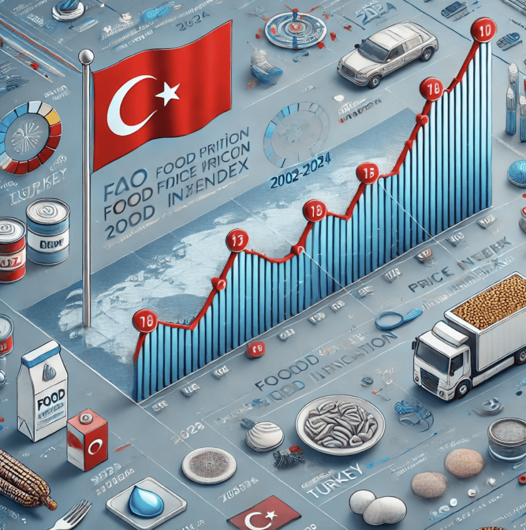 Aşağıdaki grafik, 2002-2024 yılları arasında FAO Gıda Fiyat Endeksi ile Türkiye’nin gıda enflasyonu oranlarını karşılaştırıyor. FAO endeksi (mavi çizgi), uluslararası fiyatlardaki değişimi gösterirken; Türkiye’nin gıda enflasyonu(kırmızı kesikli çizgi), iç piyasadaki maliyet artışlarını ve yerel dinamikleri yansıtıyor.