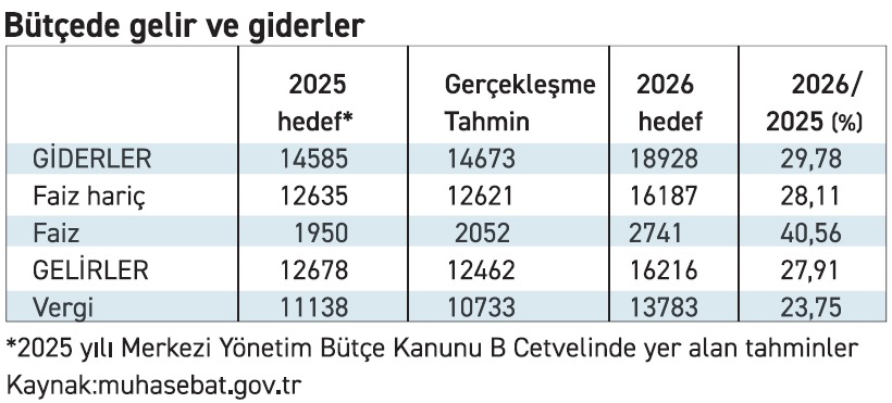- Harcama artışı enflasyonun çok üzerinde: 2026’da bütçe giderleri %29,8 artışla 18,9 trilyon TL’ye çıkacak.