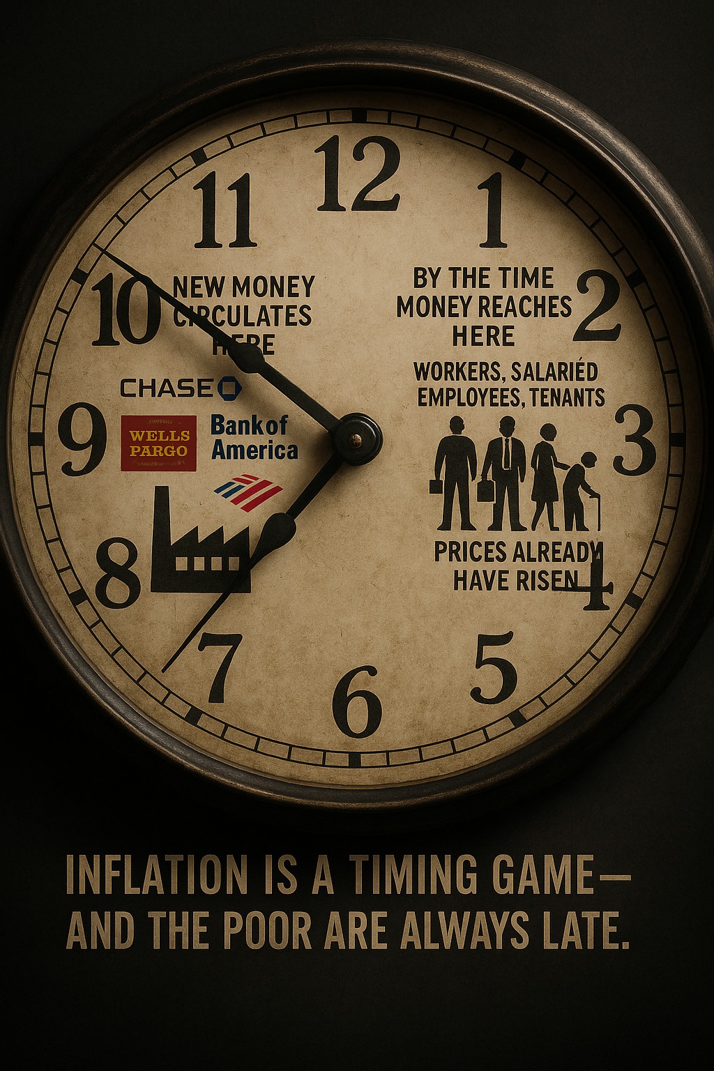 Bu hikâye 18.yy dan bu yana anlatılan ve bugün sokakta yaşadığımız gerçeğin ta kendisi. Devlet para bastığında, merkez bankası likiditeyi genişlettiğinde veya yeni kredi paketleri pompalanmaya başladığında, paranın dolaşıma giriş sırası belirleyicidir. Çünkü yeni para piyasaya girdiği anda fiyatlar henüz artmamıştır. Paraya önce ulaşan kesimler — bankalar, büyük şirketler, devletle çalışan müteahhitler, finansal oyuncular — henüz ucuzken malı, arsayı, hisseleri toplar.