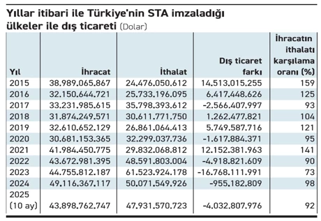 TÜİK’in genel ticaret sistemi verilerine göre Türkiye’nin STA imzaladığı 22 ülke ve 1 ülke topluluğuyla ticareti 2015’te 38,9 milyar dolarlık ihracat ve 24,4 milyar dolarlık ithalatla güçlü bir fazla üretirken, 2024’te ithalat ilk kez ihracatın üzerine çıktı. 2025’in 10 aylık döneminde ise açık daha da belirginleşti. Ticaret hacmi artmasına rağmen döviz kazandırma kapasitesinin zayıfladığı görülüyor.