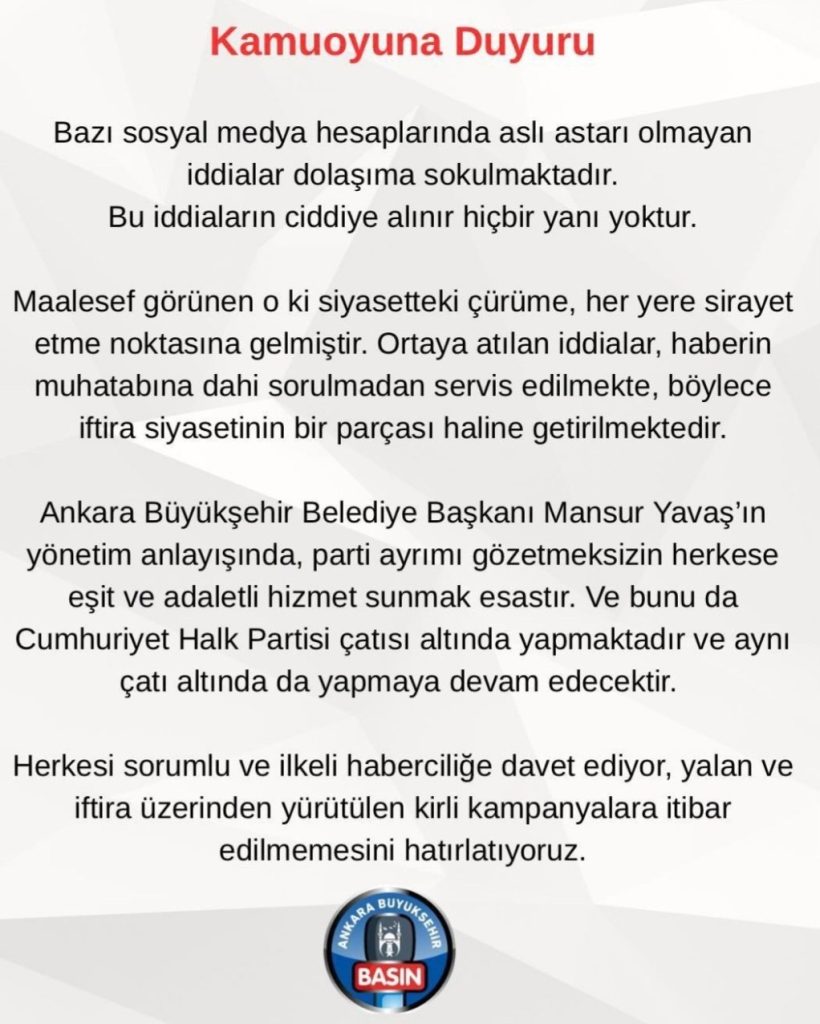 İktidar kulislerinde son günlerde en çok konuşulan senaryo, Ankara Büyükşehir Belediye Başkanı Mansur Yavaş’ın AKP’ye katılabileceği yönündeki iddia. Bu söylentiler üzerine Ankara Büyükşehir Belediyesi’nden bugün sert bir açıklama geldi: