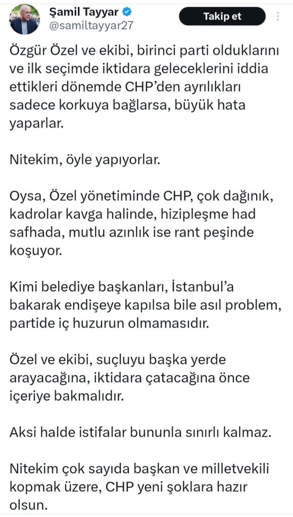 - “Çok sayıda başkan ve milletvekili kopmak üzere. CHP yeni şoklara hazır olsun.”