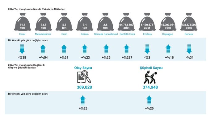 Rapora göre, 2024 yılında yalnızca esrar yakalamaları 61,5 tona ulaştı. Bu rakam, bir önceki yıla göre yüzde 38 düşüş anlamına gelse de, düşüşün nedeni talep azalmasından ziyade sentetik maddelere yöneliş olarak değerlendiriliyor. Nitekim sentetik uyuşturucu yakalamalarında yüzde 227’lik artış kayda geçti.