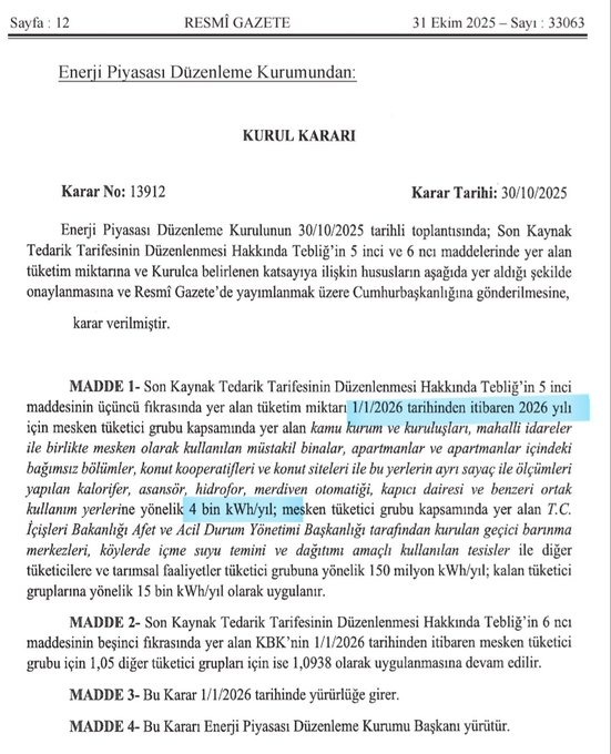 ● Önceki limit 5.000 kWh’ti; yeni düzenleme 1 Ocak 2026’da yürürlüğe girecek.